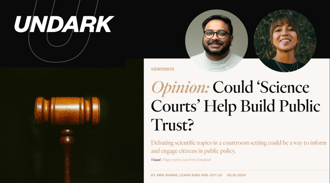 In their piece, Arik and Leana ask the question: Could ‘Science Courts’ Help Build Public Trust? After researching the history of 'science courts' and learning about methods and examples along the spectrum of public communication and engagement, the fellows explore whether "debating scientific topics in a courtroom setting could be a way to inform and engage citizens in public policy."